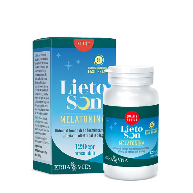 Lietoson Melatonina ? un integratore alimentare in compresse utile per contribuire alla riduzione del tempo di addormentamento e per alleviare gli effetti del jet-lag. Formulato con tecnologia fast-retard, il prodotto consente un rilascio graduale di melatonina fino a 6 ore.